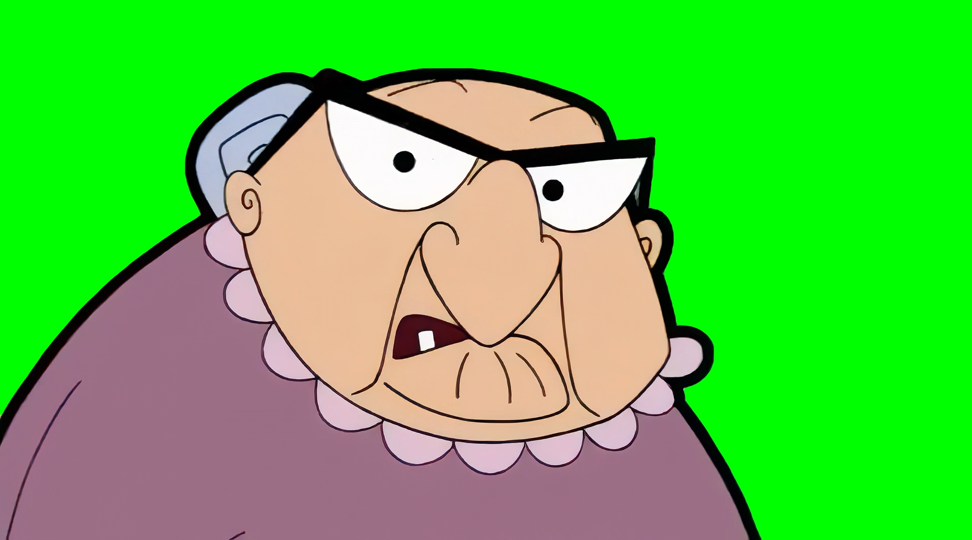 Green Screen Meme Template of Mr. Bean walking down the stairs after giving himself a haircut while Mrs. Julia Wicket comes out of her apartment and sees him, and she starts laughing at his chopped head