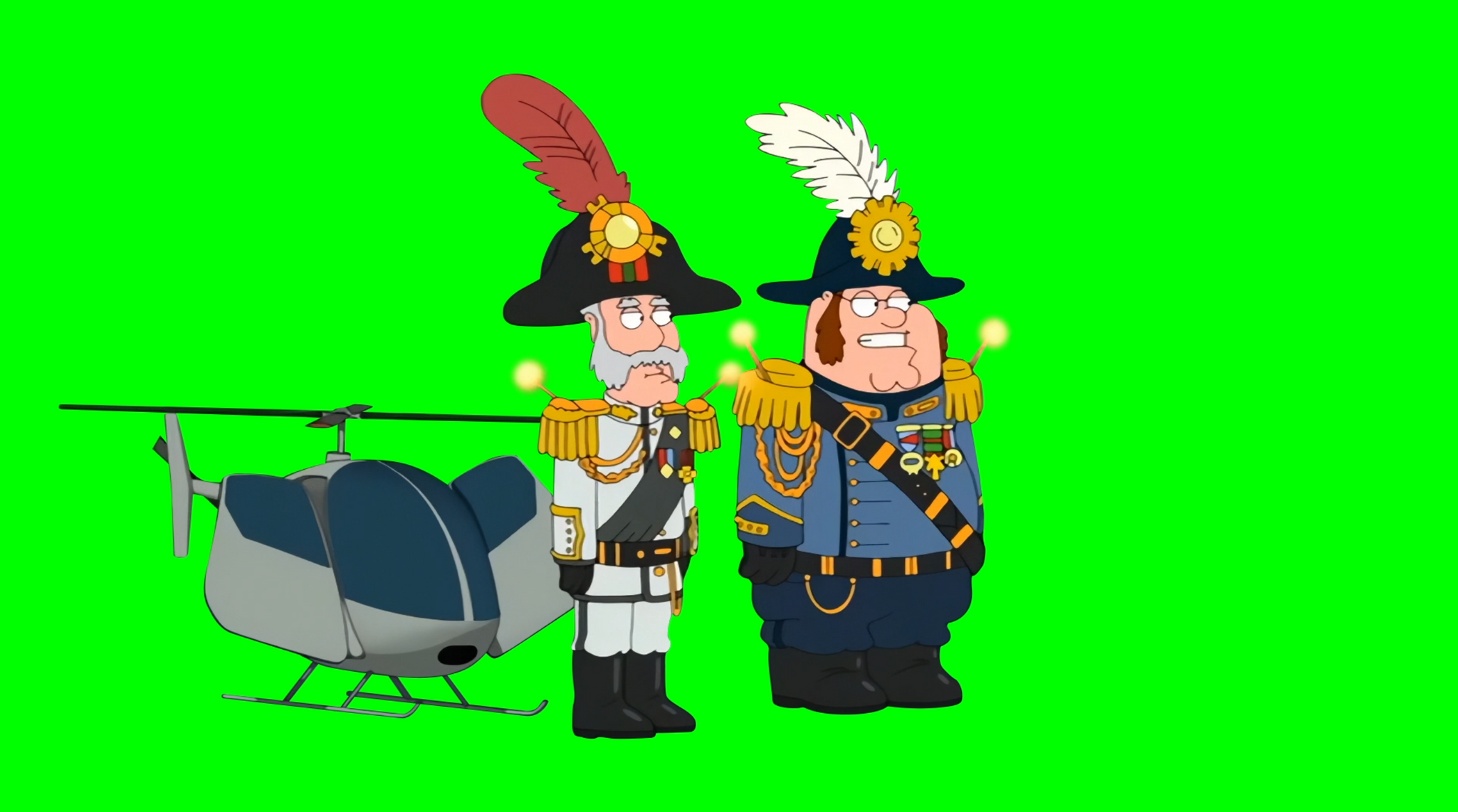 Green Screen Meme Template of Peter Griffin and Carter Pewterschmidt coming out of multiple vehicles in order to make their grand entrance, in the end Peter blows a trumpet and introduces themselves