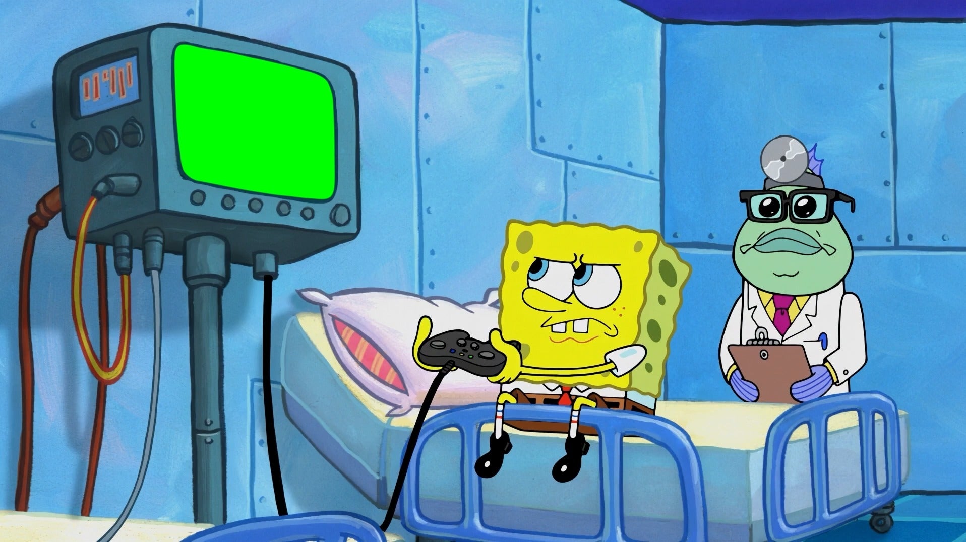 Green Screen Meme Template of SpongeBob SquarePants playing a video game with a patient monitor at the hospital which causes the patient in the other bed to move a lot.