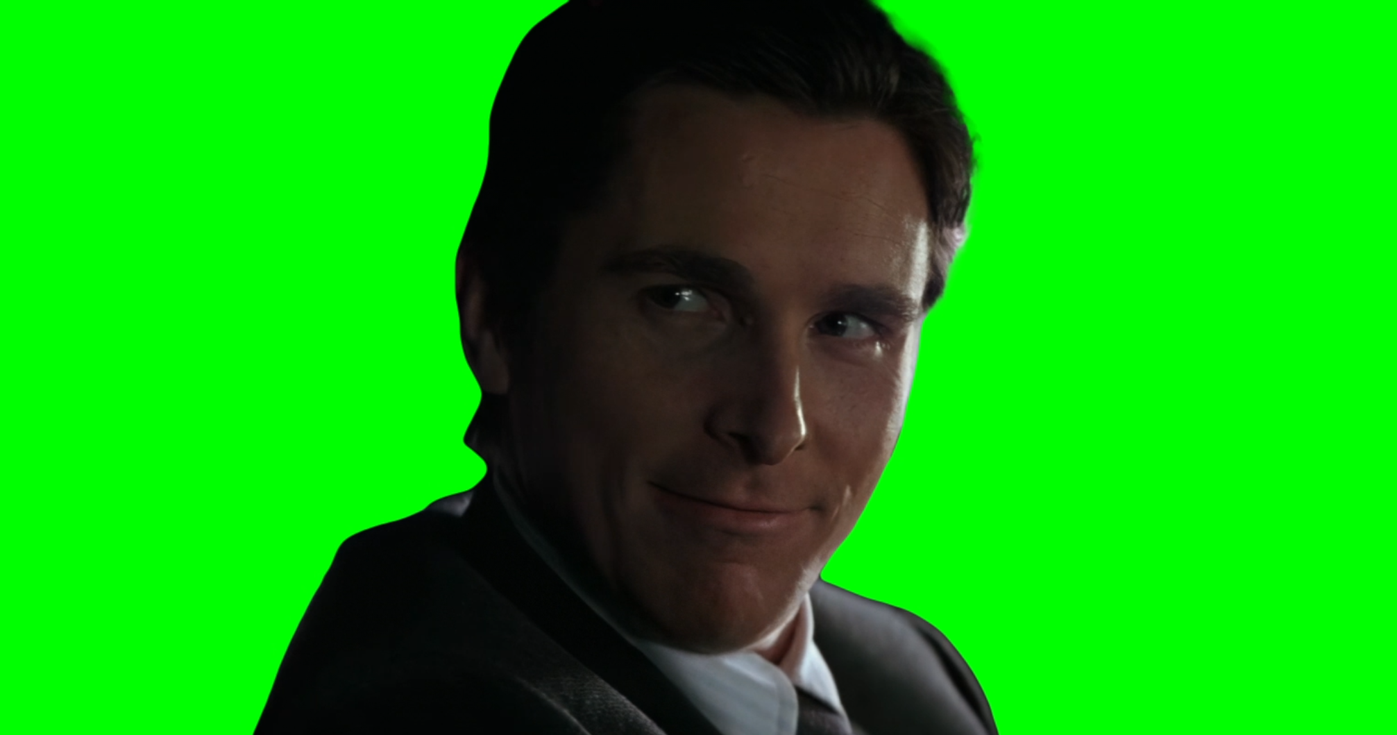 Green Screen Meme Template of Christian Bale's Bruce Wayne saying "Does It Come In Black?" to Morgan Freeman's Lucius Fox