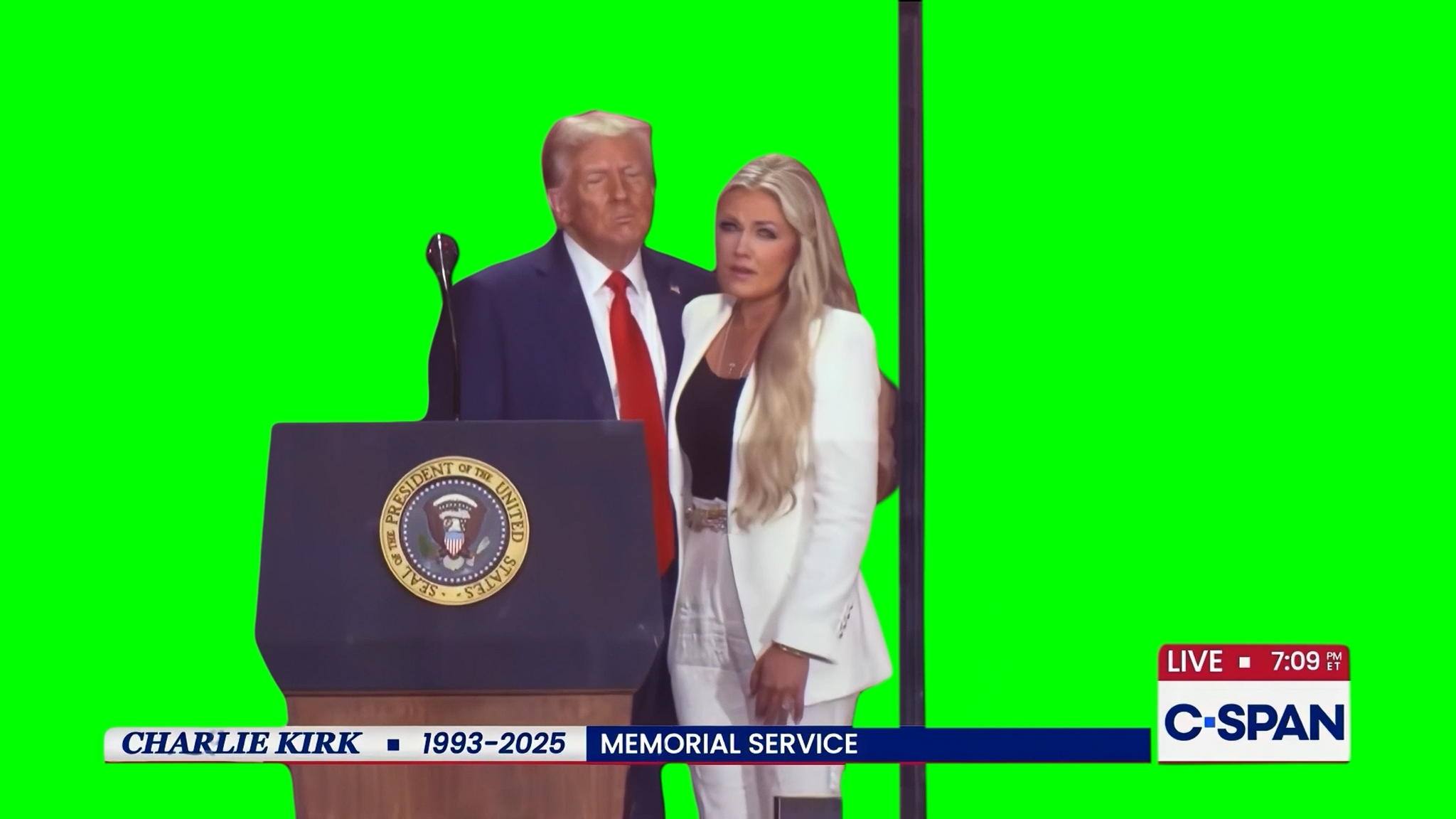 Green Screen Meme Template of the President of the United States of America, Donald Trump, hugging Charlie Kirk's wife, Erika Kirk, at the end of his funeral