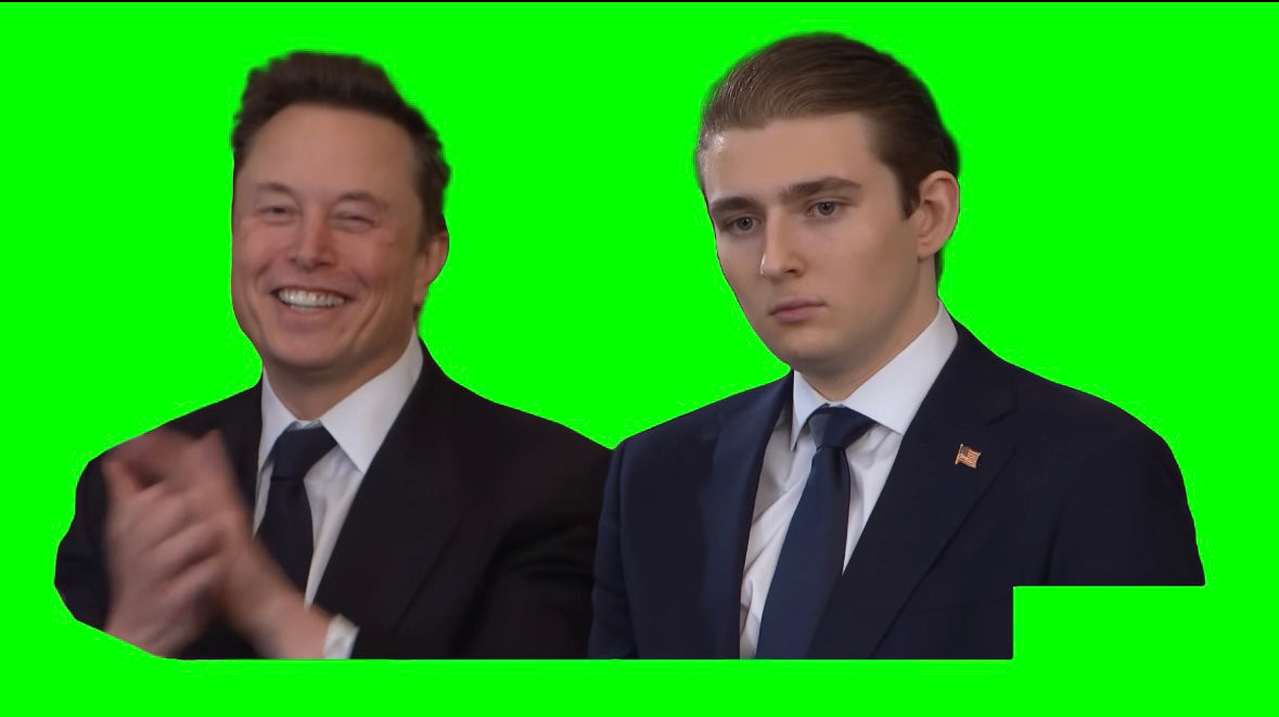 Green Screen Meme Template of Elon Musk clapping and showing thumbs up, while Barron Trump sits stoically beside him during Trump’s Mars mission announcement at his inauguration.