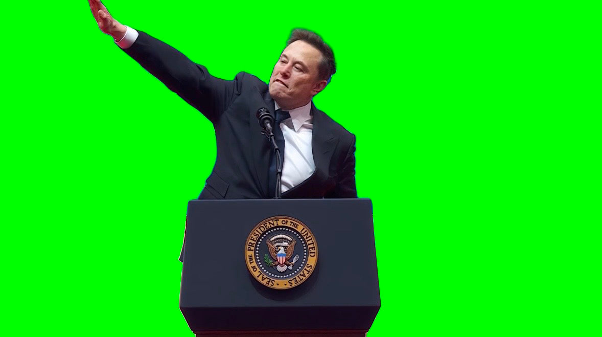 Green Screen Meme Template of Elon Musk doing a speech on Inauguration Day, ending it by saying, "Thank you", and doing the hand salute at the end.