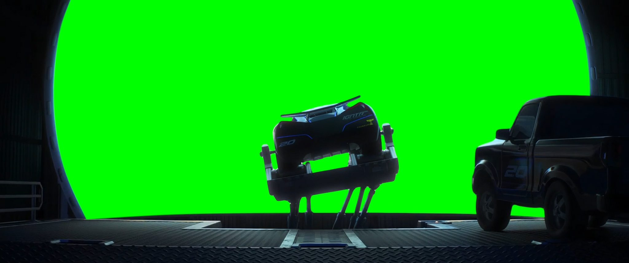 Green Screen Meme Template of Jackson Storm training in a Piston Cup Racing simulator when he asks "Who is that?" and Ray Reverham says "I put McQueen in there, to give you some real competition" and they both start laughing