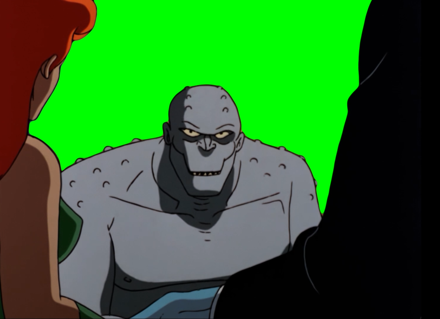 Green Screen Meme Template of Killer Croc saying "I threw a rock at him!" and then the Penguin, Joker, Two-Face, and Poison Ivy proceeds to stare at him disgustingly