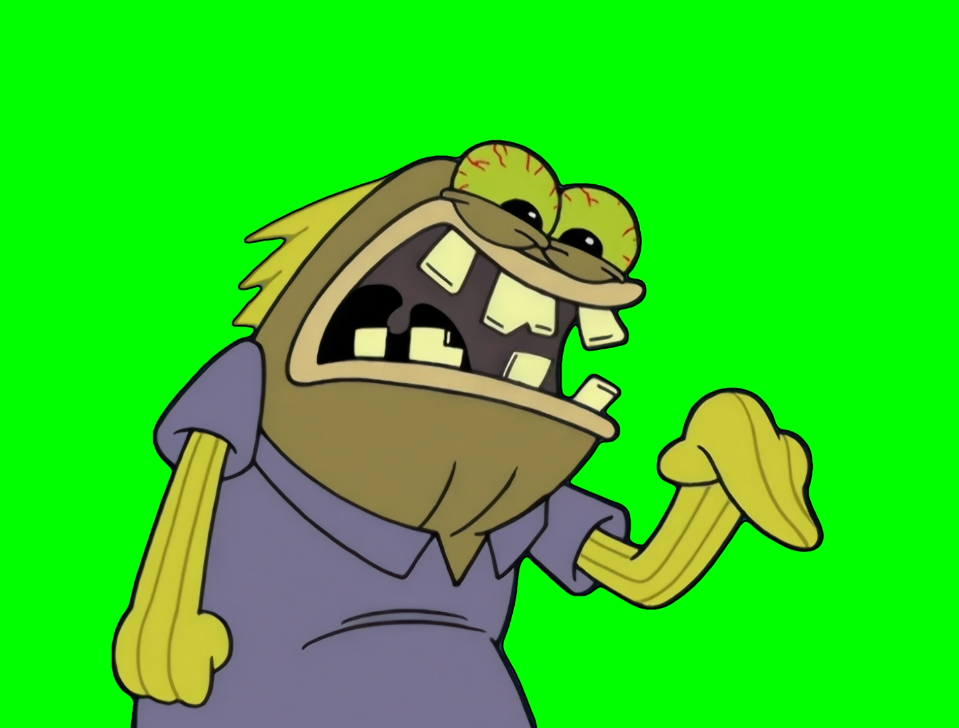 Green Screen Meme Template of a fish approached SpongeBob and Patrick while they are scared, shouting and saying "Finally! Now that I got you, I'd like to buy all your chocolate." which causes Patrick to fart out chocolates from his pants