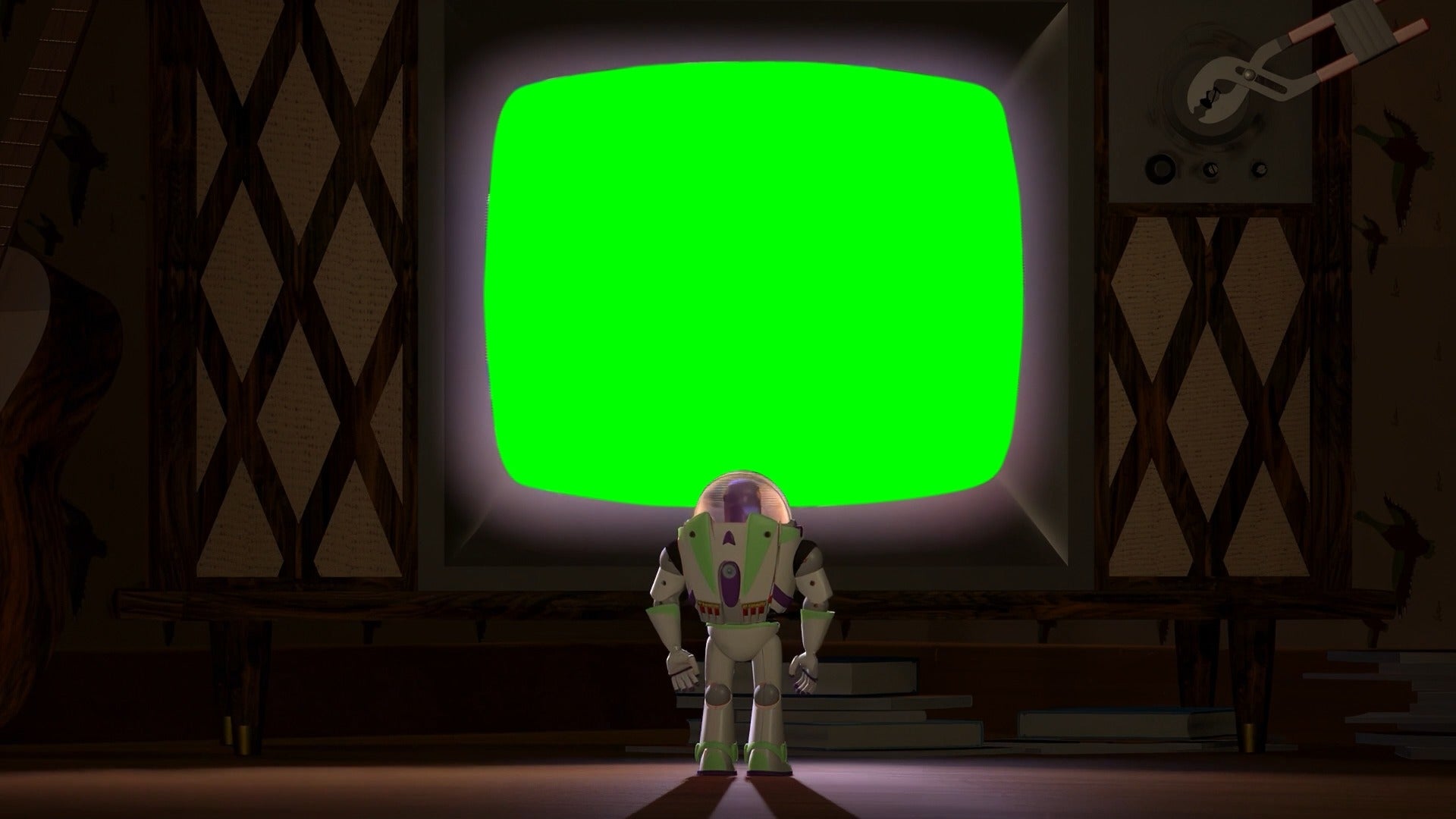 Green Screen Meme Template of Buzz Lightyear looking at television screen and being shocked and upset