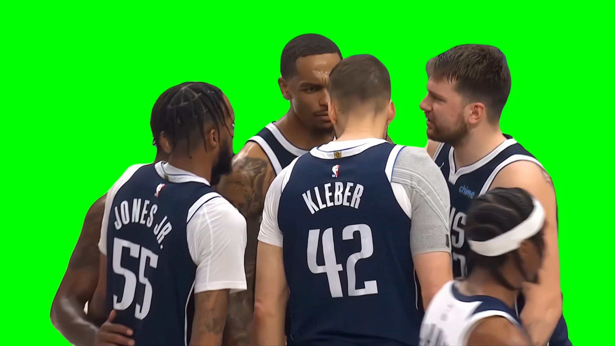 Green Screen Meme Template of the Dallas Mavericks screaming at Maxi Kleber to join their huddle during Game 4 of the 2024 NBA Western Conference Finals vs the Minnesota Timberwolves