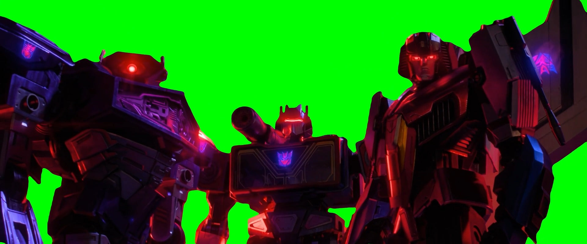 Green Screen Meme Template of Megatron saying "Decepticons, rise up!" with Starscream, Soundwave, and Shockwave standing menacingly