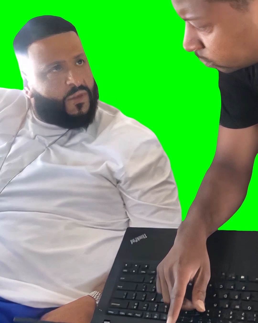 Green Screen Meme Template of DJ Khaled saying "BUDGET APPROVED!" at a guy holding a laptop