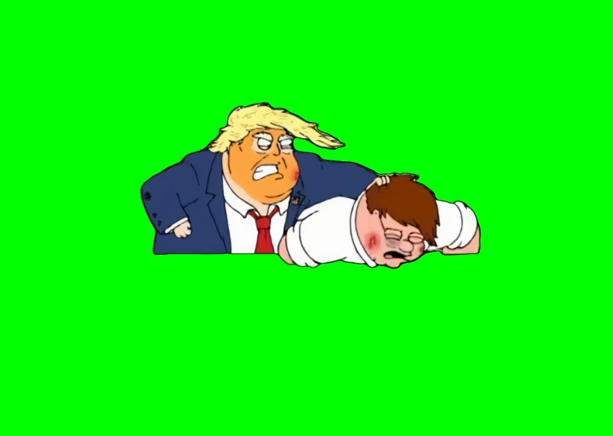 Green Screen Meme Template of Donald Trump holding Peter Griffin's head, and pressing the red buttons on the President's Table by hitting Peter's head against them