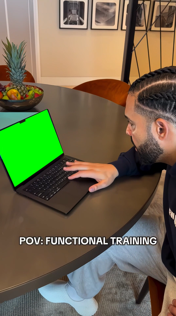 Green Screen Meme Template of Drake training his index finger by lifting weights with it in order to press space bar on his laptop effectively