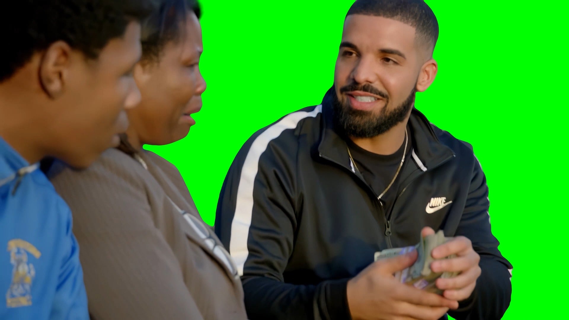 Green Screen Meme Template of Drake giving away money to a woman and his son and she starts crying in Drake in the God's Plan Music Video