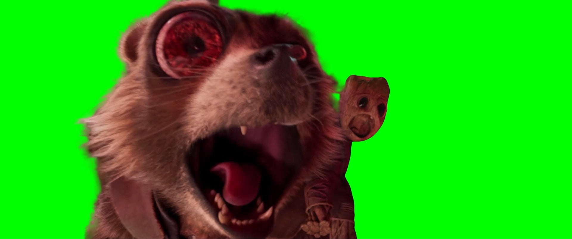 Green Screen Meme Template of the faces of Kraglin, Yondu, Rocket, and Groot being distorted as they are jumping through space