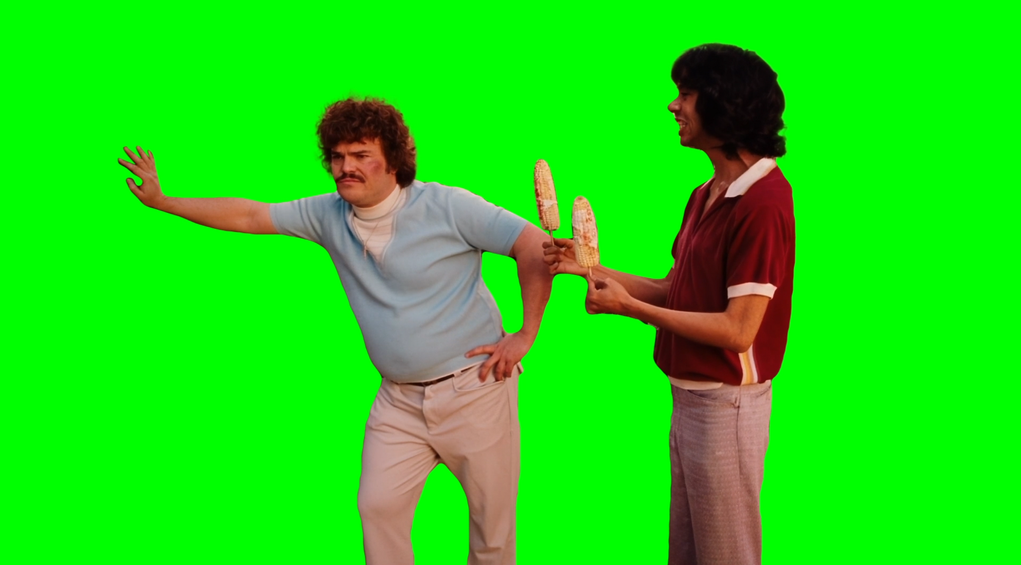Green Screen Meme Template of Ignacio/Nacho slapping two corn cobs off of Steven/Esqueleto's hands and saying "Get the corn out of my face!"