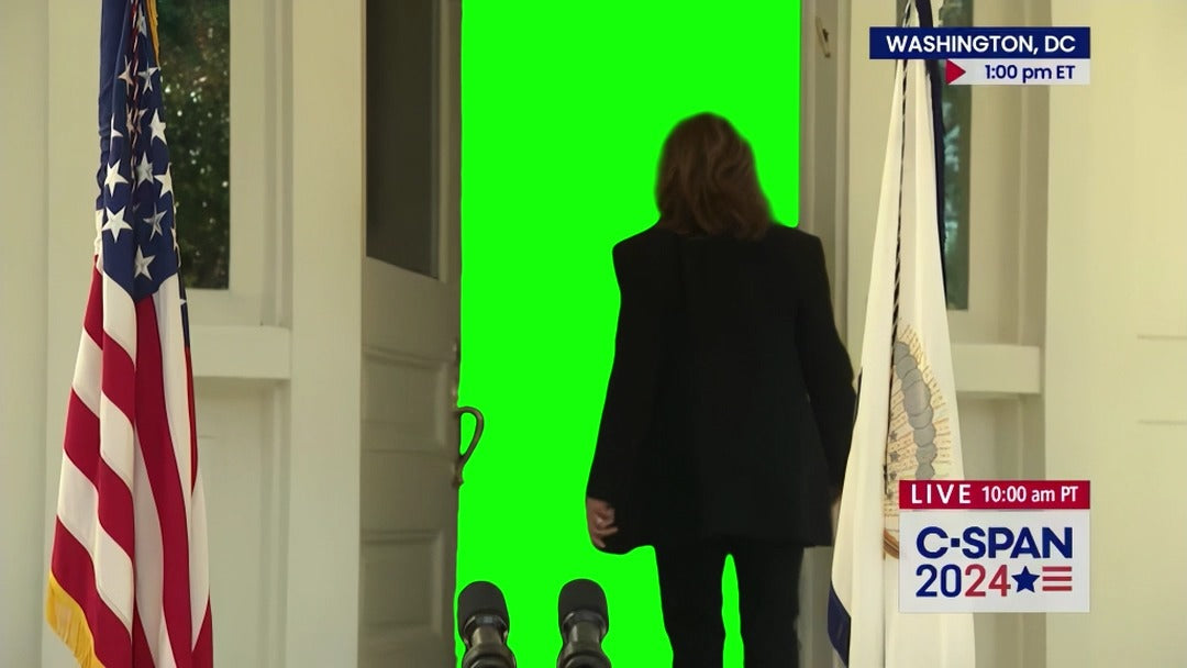 Green Screen Meme Template of Kamala Harris walking away from a speech and opening a door