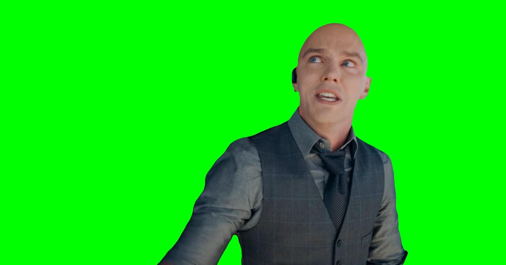 Green Screen Meme Template of Lex Luthor commanding Ultraman to punch Superman in the face by saying ''1A! 1A! 1A!'' while being full of hate and anger