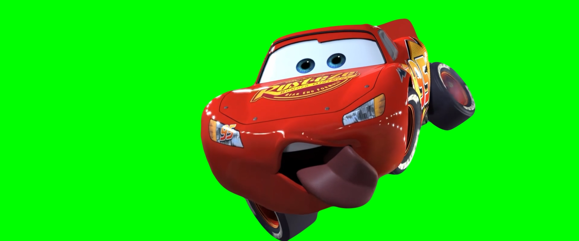 Green Screen Meme Template of Lightning McQueen flying in the air with his tongue out and winking at 2 cars