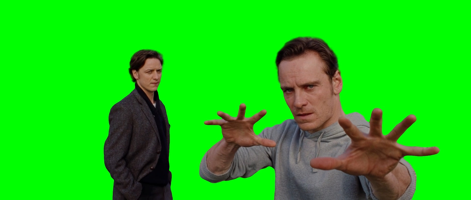 Green Screen Meme Template of Magneto trying to turn the Satellite and fails while Charles Xavier keeps looking
