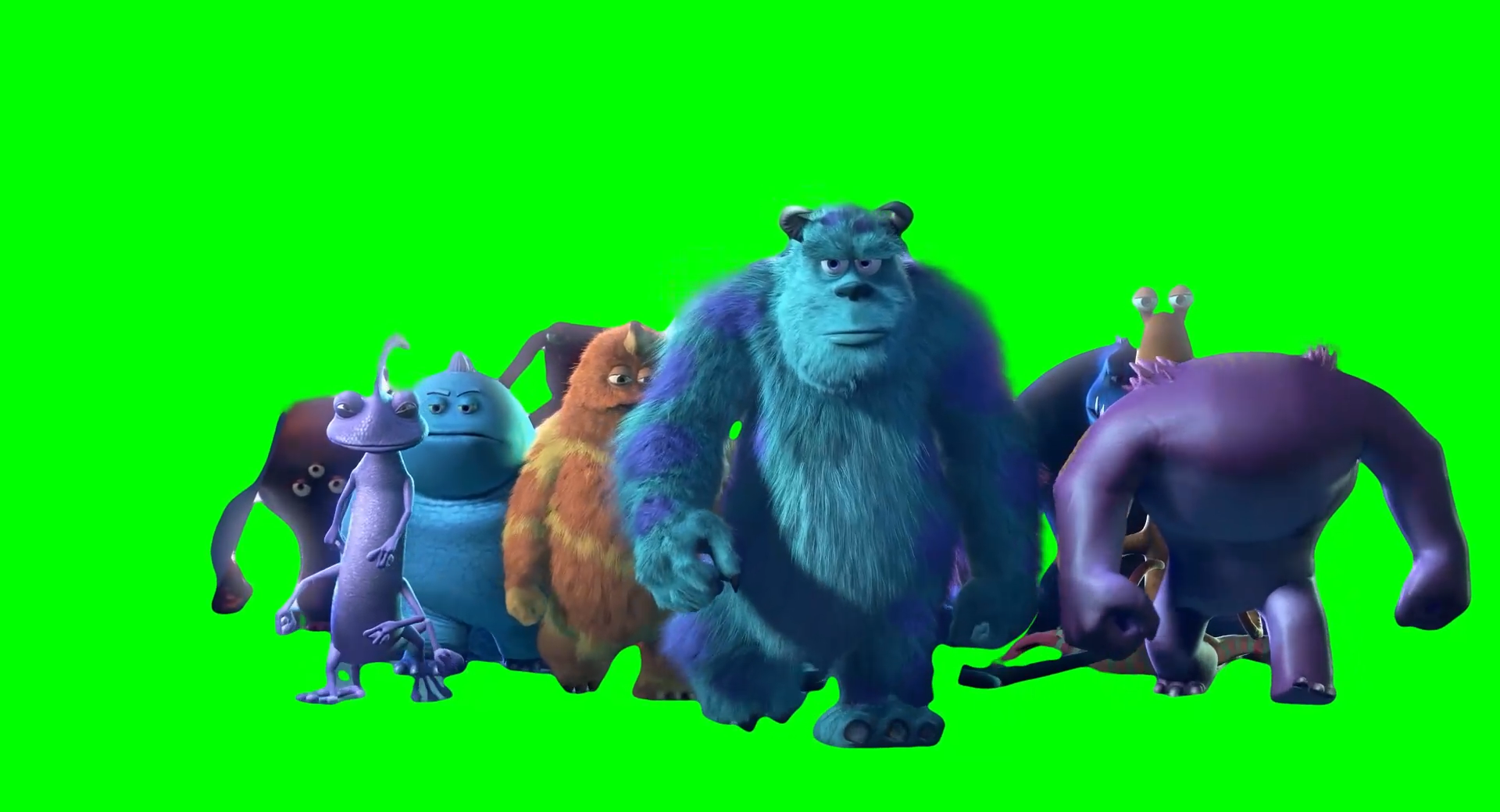 Green Screen Meme Template of Sulley walking with other monsters in the Monsters, Inc. movie