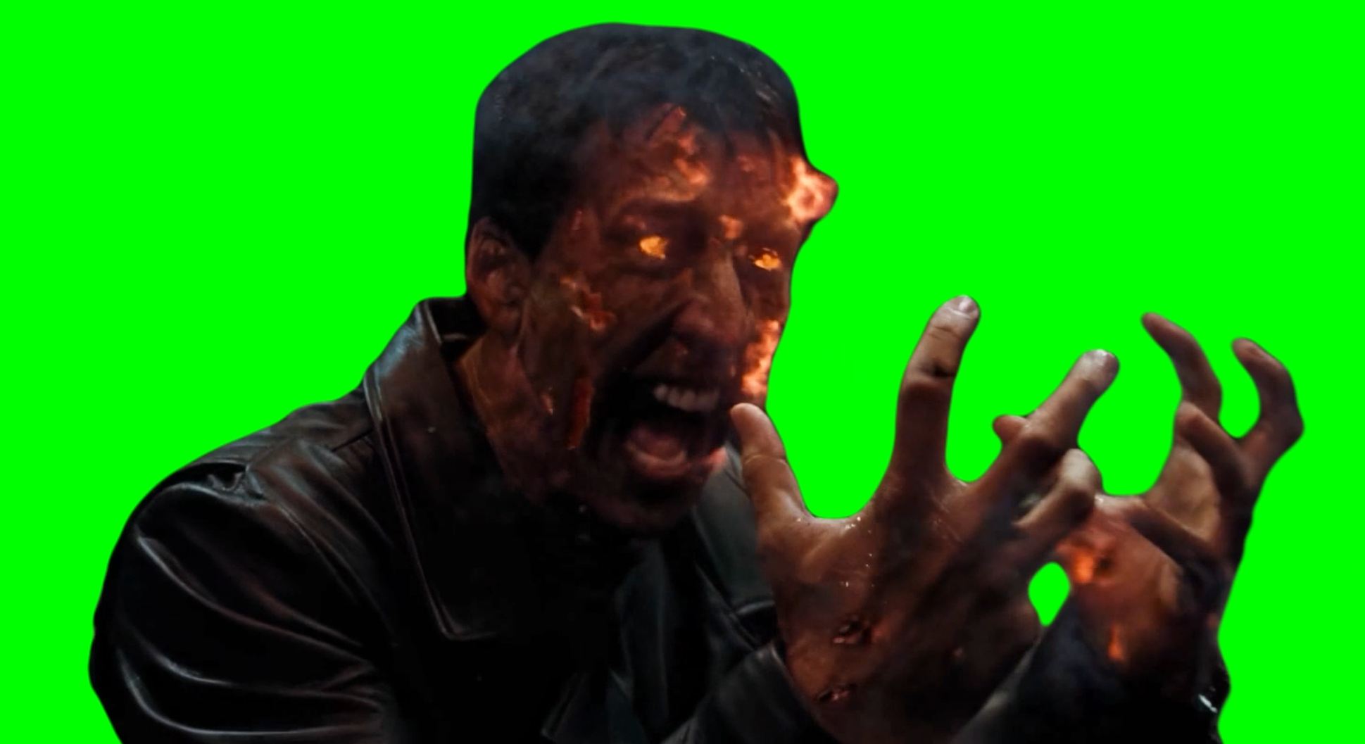 Green Screen Meme Template of Nicolas Cage laughing while transforming into the Ghost Rider