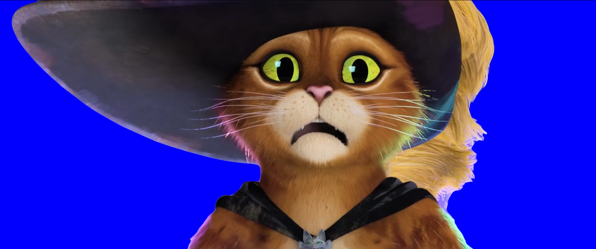 Green Screen Meme Template of Puss in Boots saying "He's here for me" after seeing Death the Wolf in the Puss in Boots: The Last Wish movie V2 (Blue Screen)