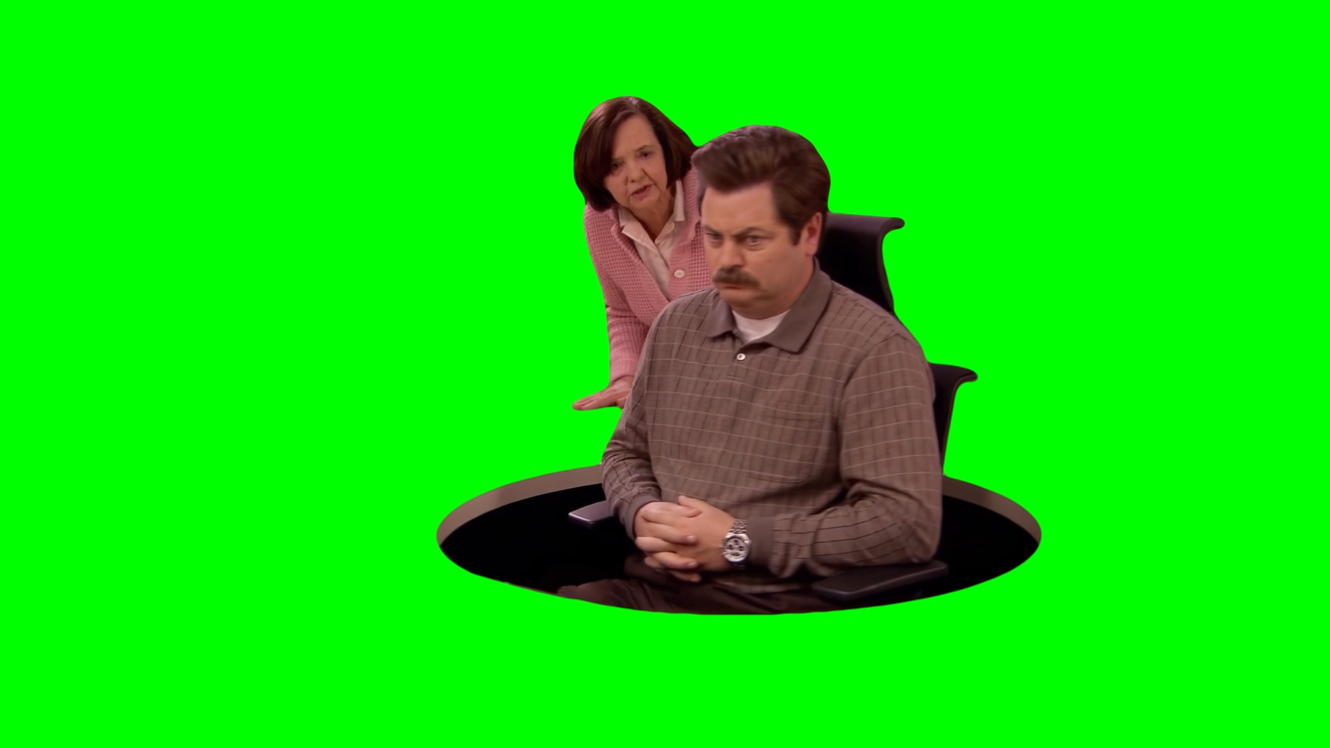 Green Screen Meme Template of Ron Swanson rotating and ignoring a woman's complaint about a park