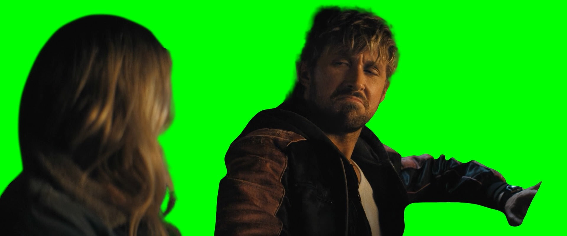 Green Screen Meme Template of Emily Blunt saying "How have you been?" to Ryan Gosling and then him doing the thumbs up in The Fall Guy movie