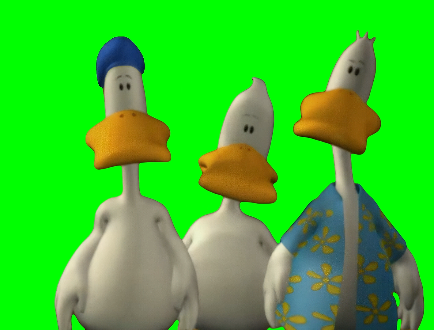 Green Screen Meme Template of Bill telling Ed, Oly, and Waddle about getting a job and being employed while the 3 ducks stand there confused, then Bill says "I am talking about WORK!" which causes the three ducks to be scared, the little duck saying "You said a bad word!"