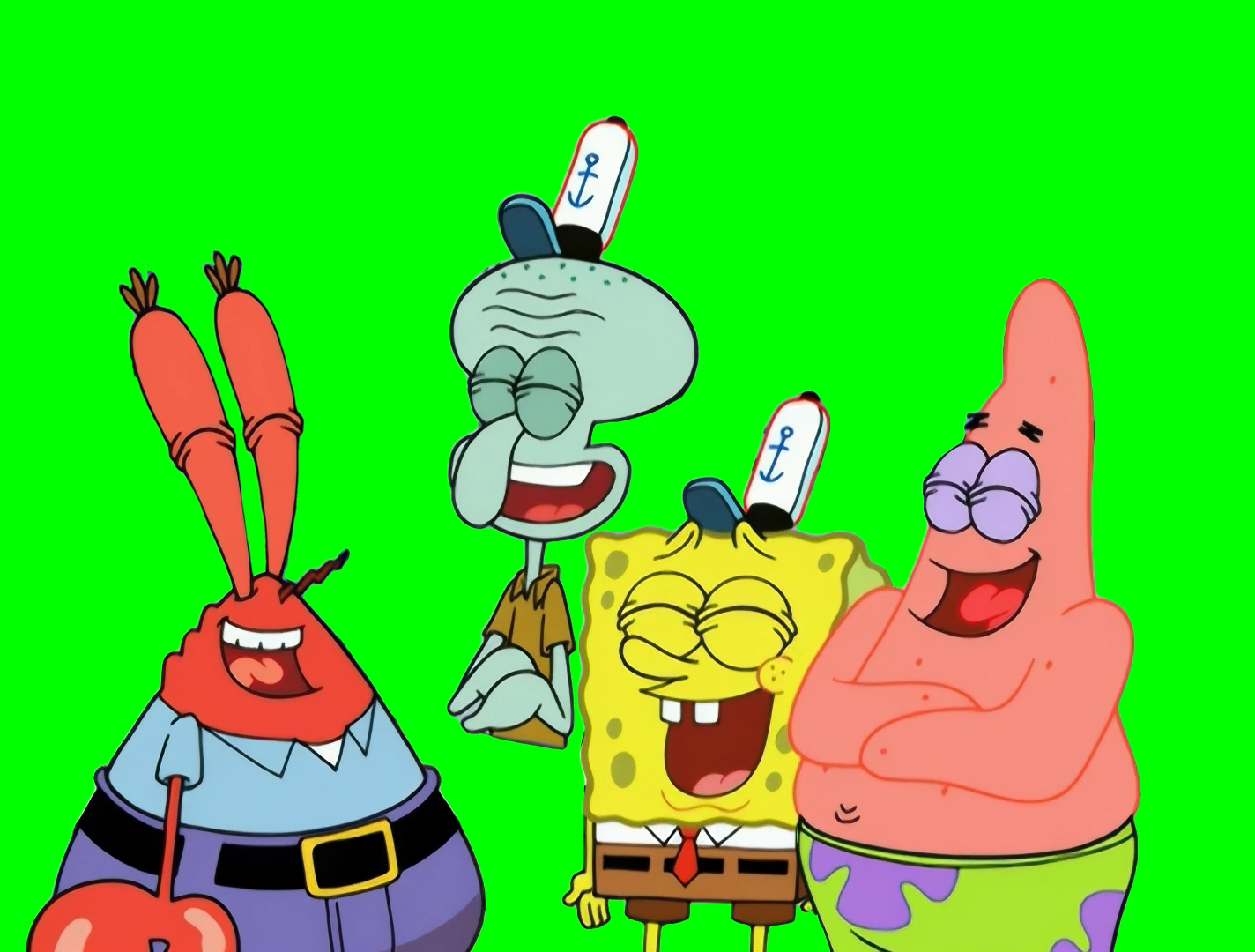 Green Screen Meme Template of Spongebob, Squidward, Patrick, and Mr. Krabs laughing together at a customer after Mr. Krabs hands him a burger, stop laughing and walking away one by one