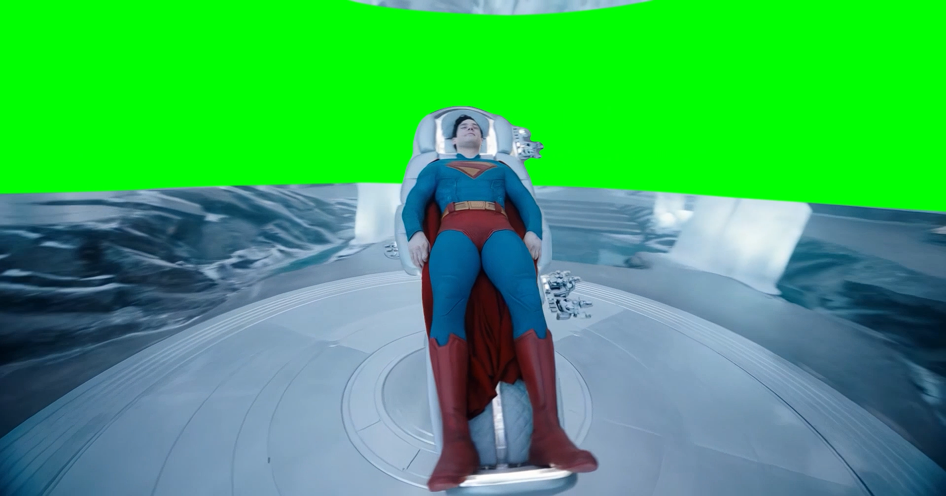 Green Screen Meme Template of Superman lying on the chair as the Superman Robot nurse him back to health as Superman looks at the hologram that plays his childhood memories that make him happy