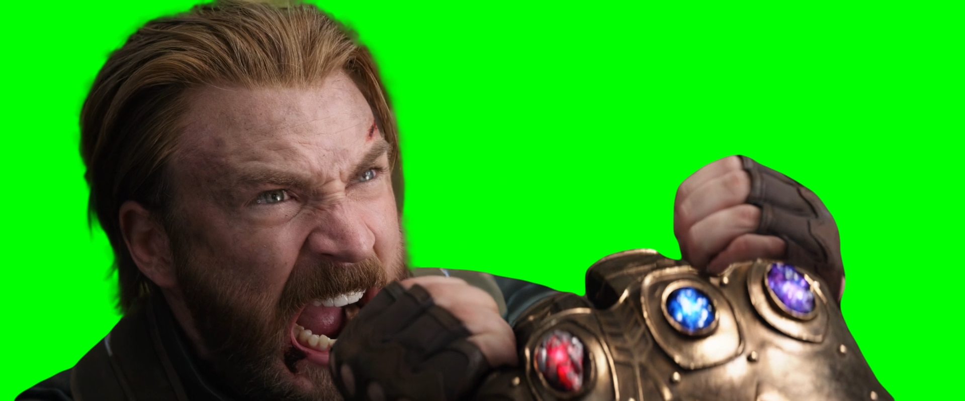 Green Screen Meme Template of Steve Rogers trying to stop Thanos from snapping while he wears the Infinity Gauntlet with all the Infinity Stones, and Thanos punches him