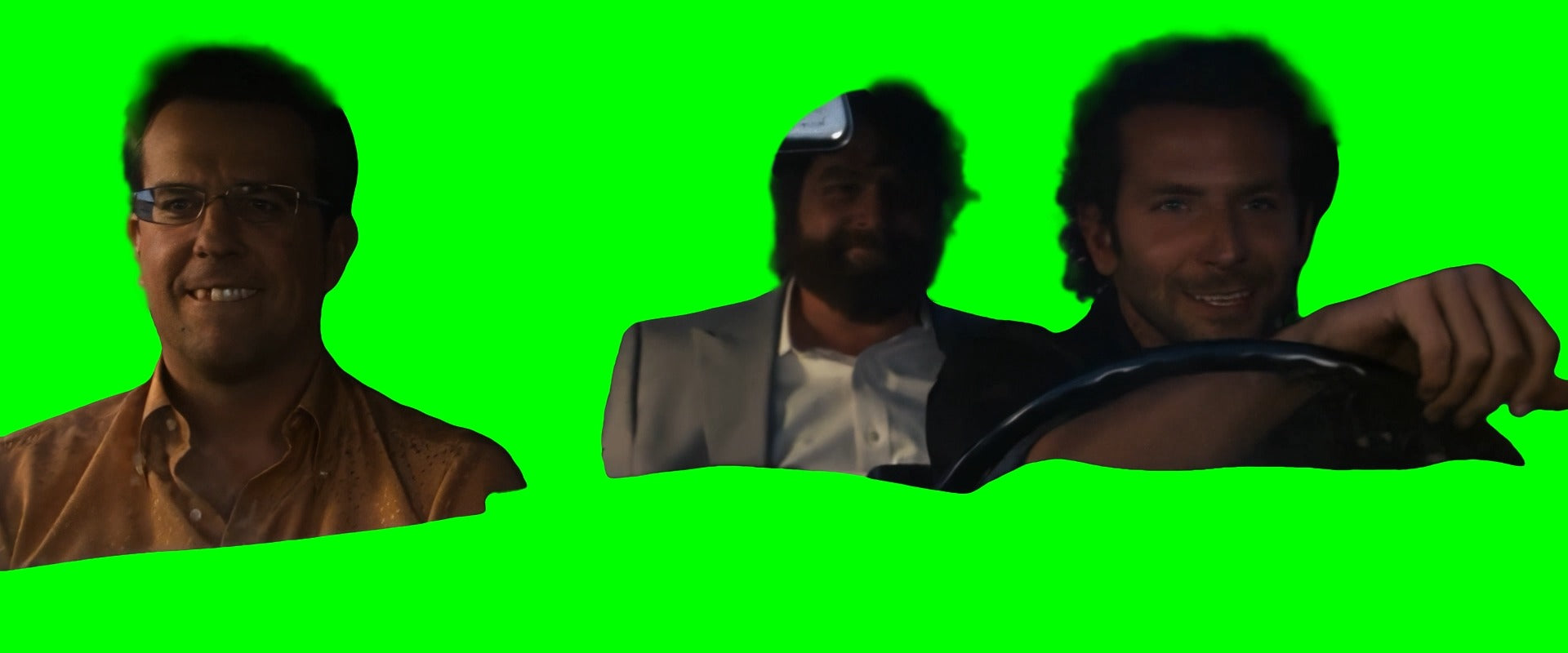 Green Screen Meme Template of Phil and Stu saying "WE ARE BACK BABY!" in the car on a road trip to Las Vegas