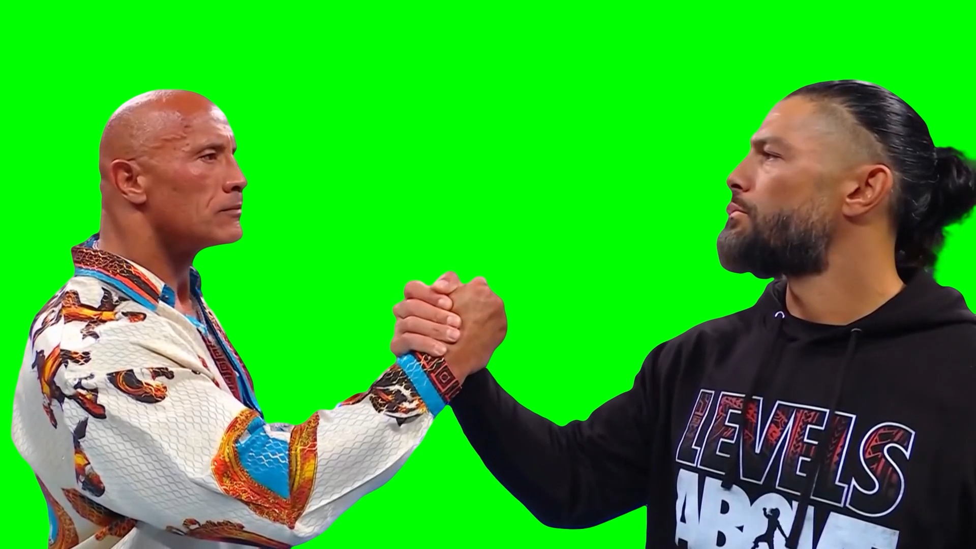 Green Screen Meme Template of The Rock and Roman Reigns doing a handshake and hugging each other