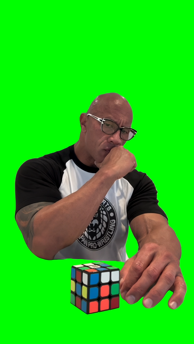 Green Screen Meme Template of Dwayne "The Rock" Johnson looking at a Rubik Cube and thinking how to solve it while wearing a New Japan Pro Wrestling shirt, hinting at a possible collaboration with WWE