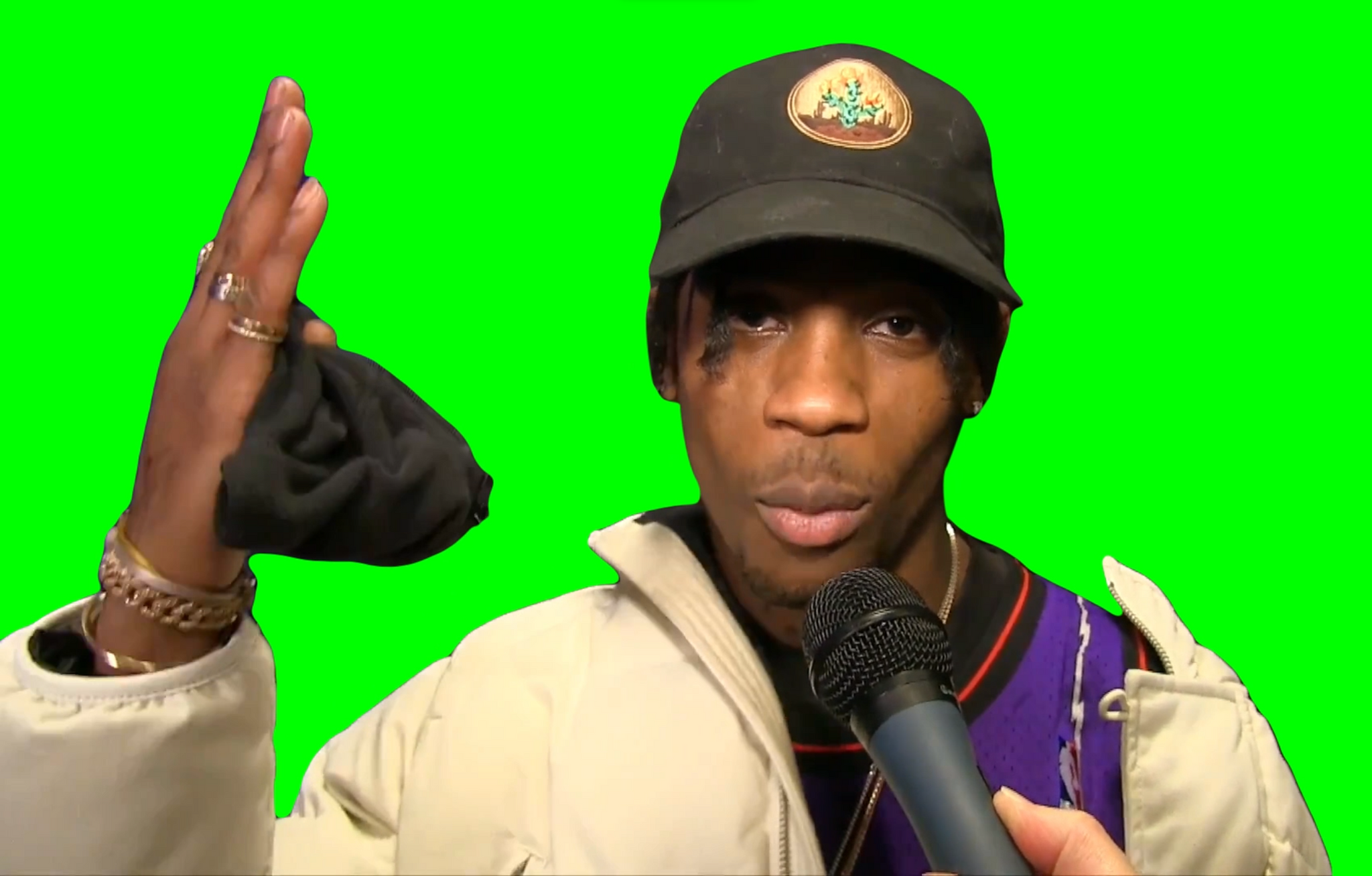 Green Screen Meme Template of Travis Scott saying "What are those?" to Nardwuar's shoesSource: https://youtu.be/6URfttgulQE?si=NjQa3sFB1CVmUxDK