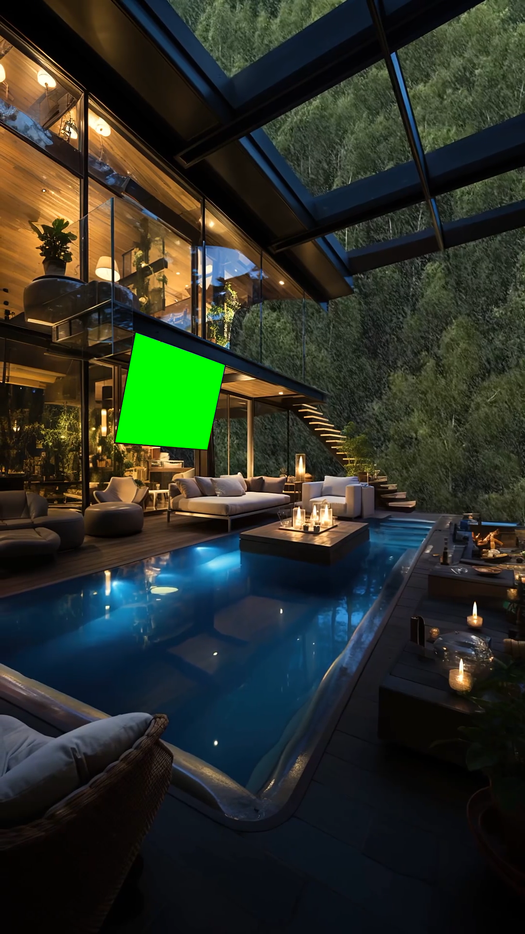Green Screen Meme Template of a TV Screen inside a swimming pool living room inside a big mansion