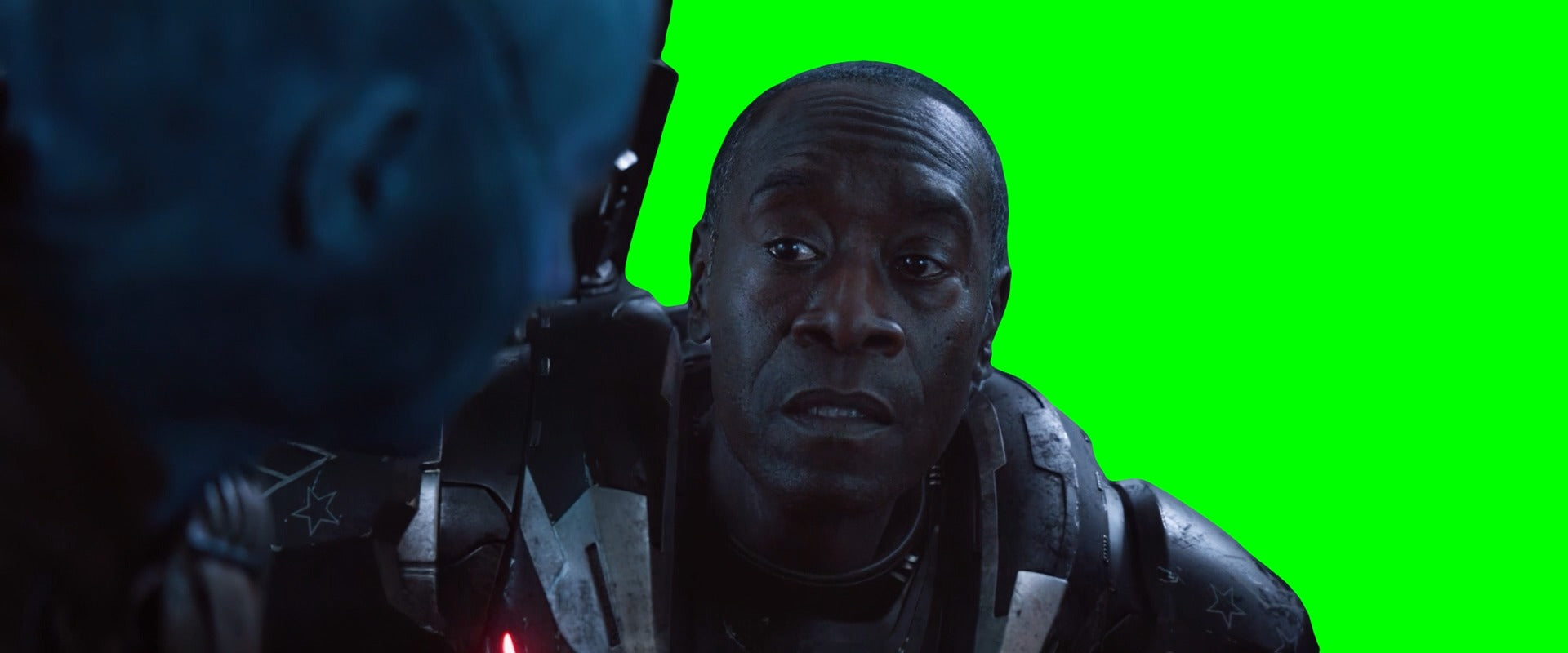 Green Screen Meme Template of War Machine and Nebula watching Star-Lord while he's singing and dancing and then Rhodey asks "So, he's an idiot?"