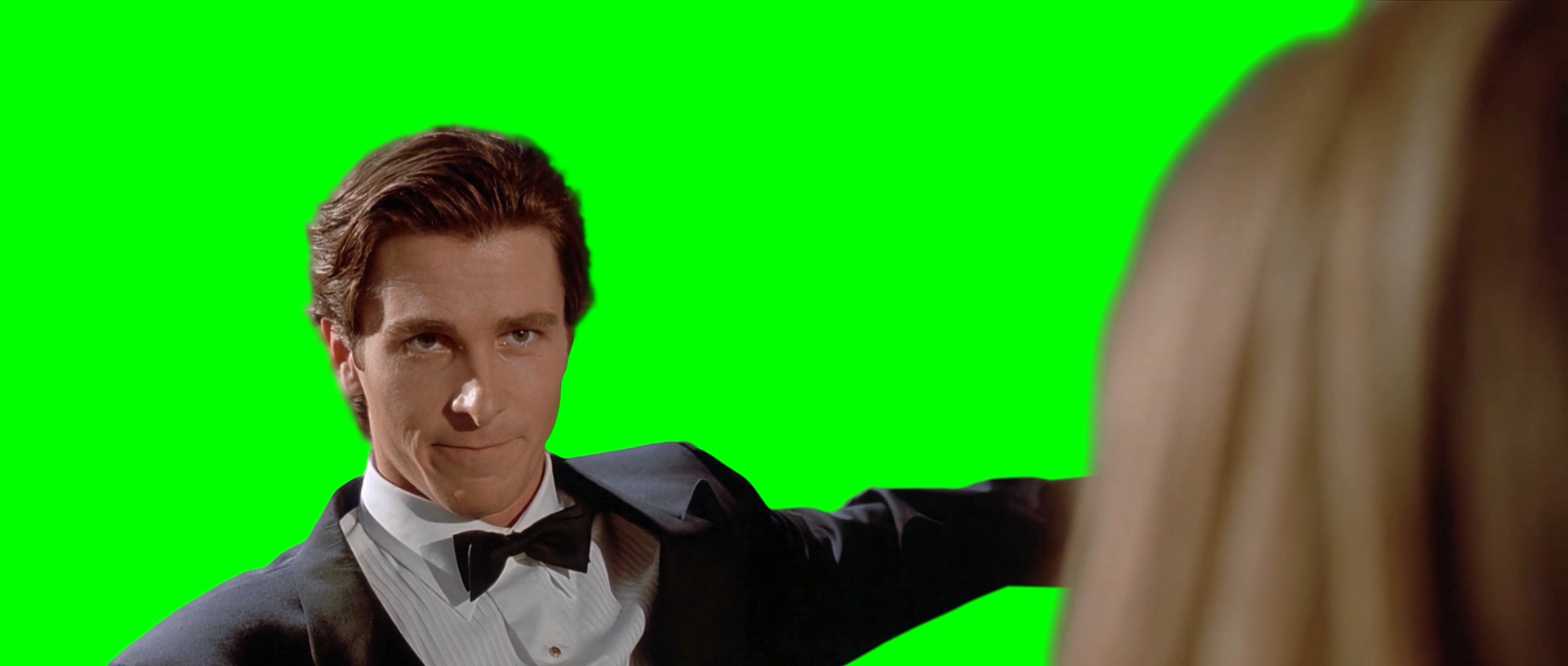 Green Screen Meme Template of Patrick Bateman saying "Well actually, that's none of your business" to Christie in the American Psycho movie