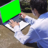 • Man Using Laptop at Beach meme (Green Screen)