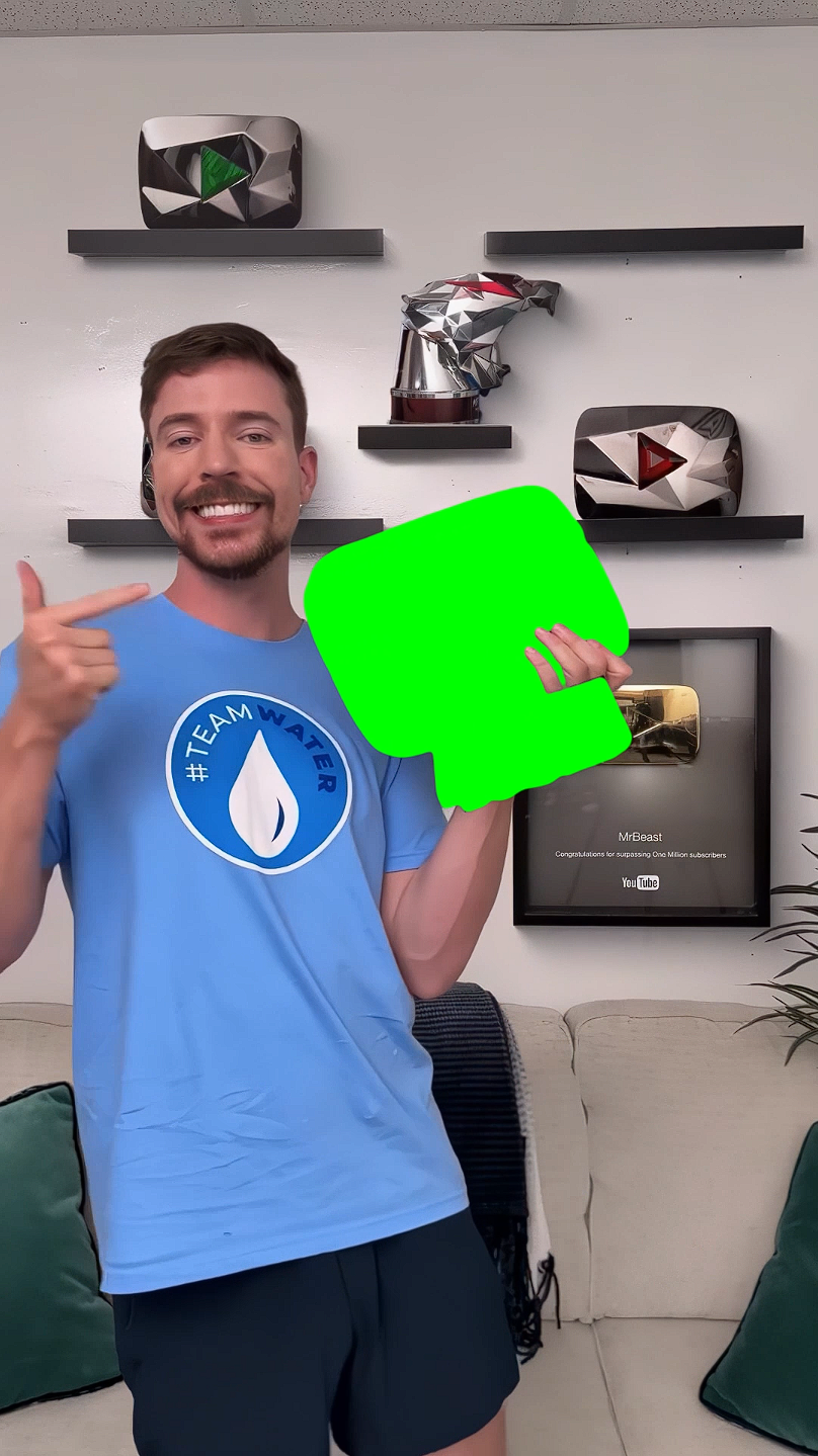 Green Screen Meme Template of MrBeast showing off every YouTube play button he has and also asking to subscribe for the 500M Button